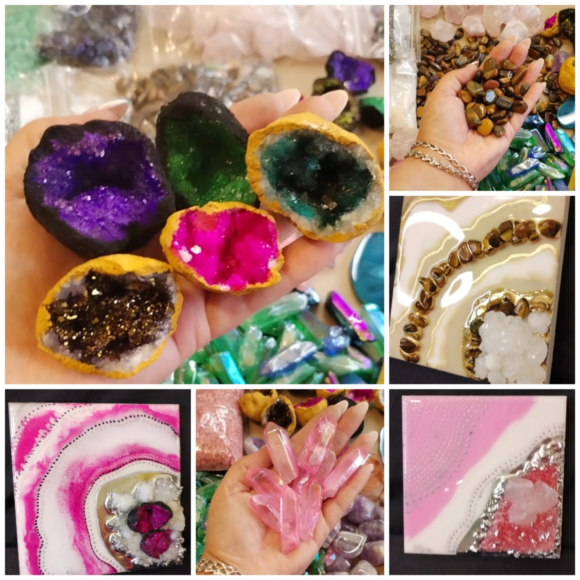Ezért festményeink főként epoxy gyantából, kristályokból, geódákból és üveg kristályokból készülnek.